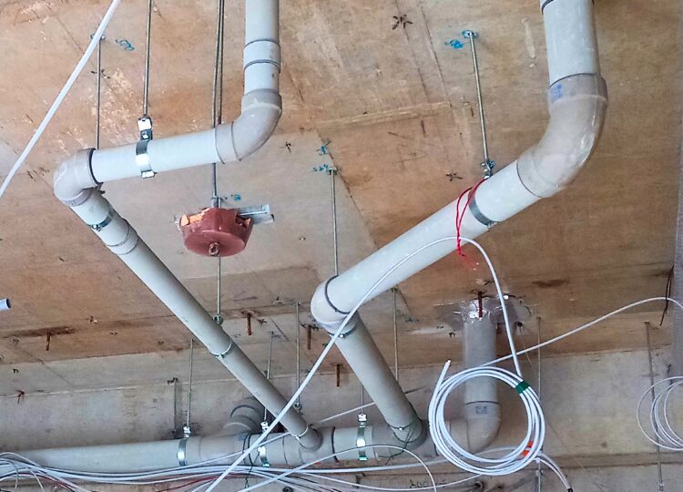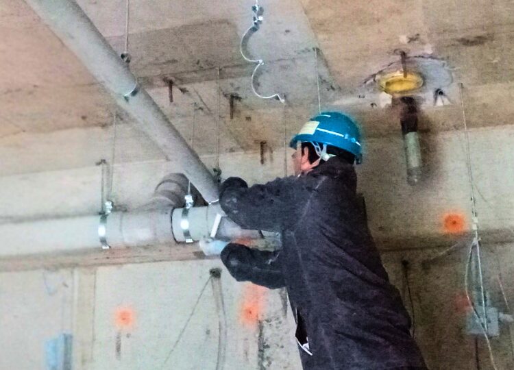 店舗や工場などで、いざという時に消火を行うスプリンクラーの配管や設置工事を行います。